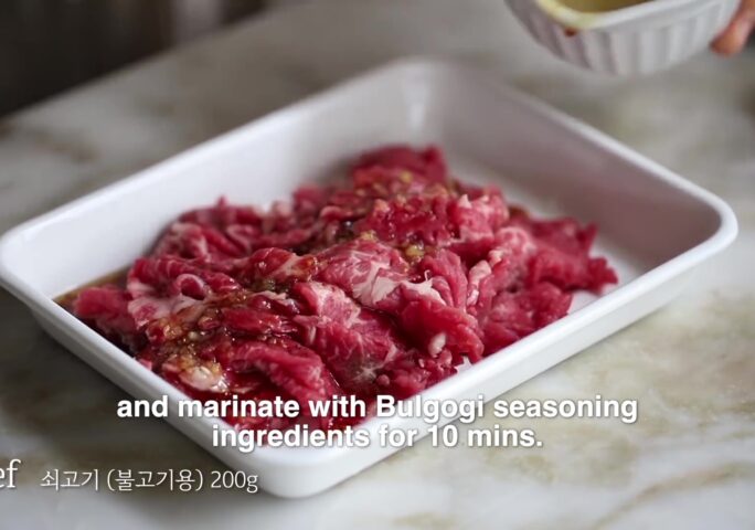 Place beef on a kitchen towel to remove the blood, cut the beef into bitesize pieces, and marinate with Bulgogi seasoning ingredients for 10 mins.