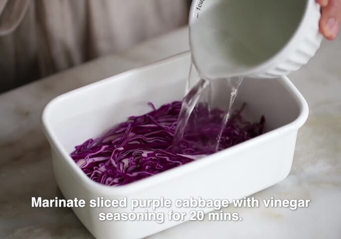 Slice purple cabbage thinly. Marinate sliced purple cabbage with vinegar seasoning for 20 minutes.