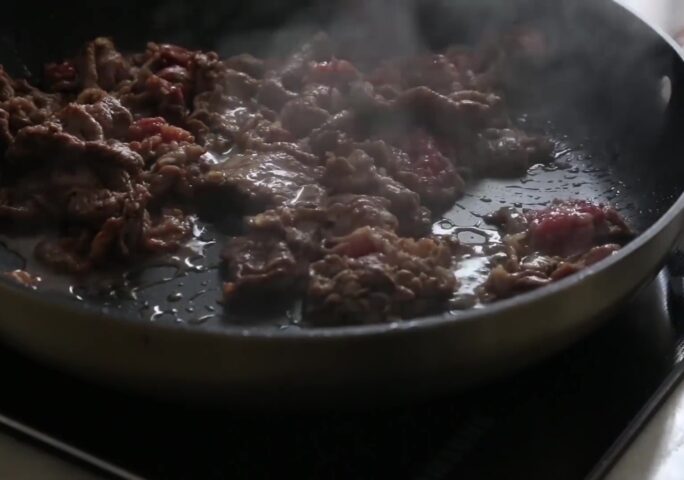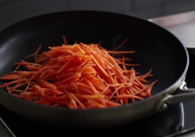 Transfer carrot to a bowl, wipe out the pan with kitchen paper. Add marinated beef to a pan and stir-fry until the moisture is completely disappeared.