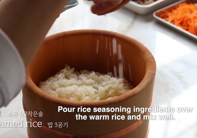 Pour rice seasoning ingredients over the warm rice and mix well.