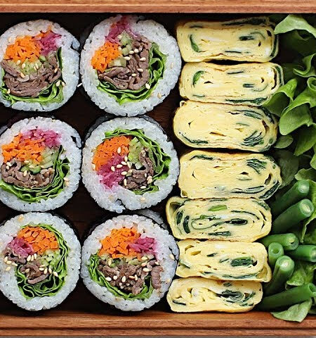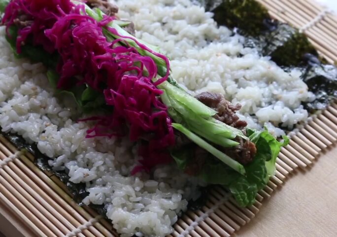 Kimbap’s beautiful circular surface with fully filled various ingredients always makes people happy. This time, we’re going to make everyone’s favorite menu Kimbap. Especially in this recipe, we add some pickled purple cabbage and lettuce to add sweet and sour taste and crunchy texture.