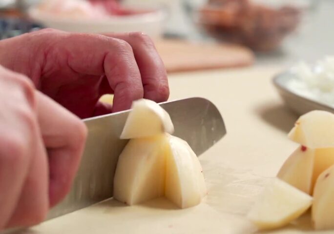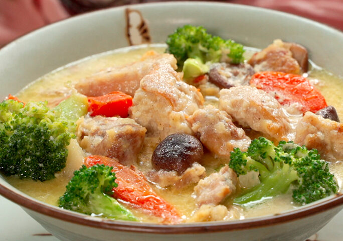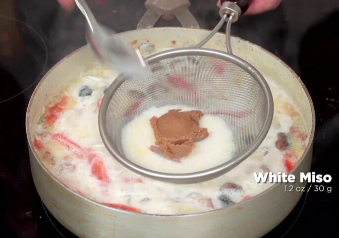 Stir fry bacon until sizzling. Add onions and carrots, and cook until onions are transparent. Add shiitake mushrooms and potatoes. Pour in the milk and water, and cook until carrots are soft. Miso is a traditional Japanese seasoning paste made from soy beans fermented in salt, rice, seaweed, or other ingredients. White miso was fermented in a large percentage of rice, so the taste is a lot sweeter, which is perfect for our creamy miso stew!
