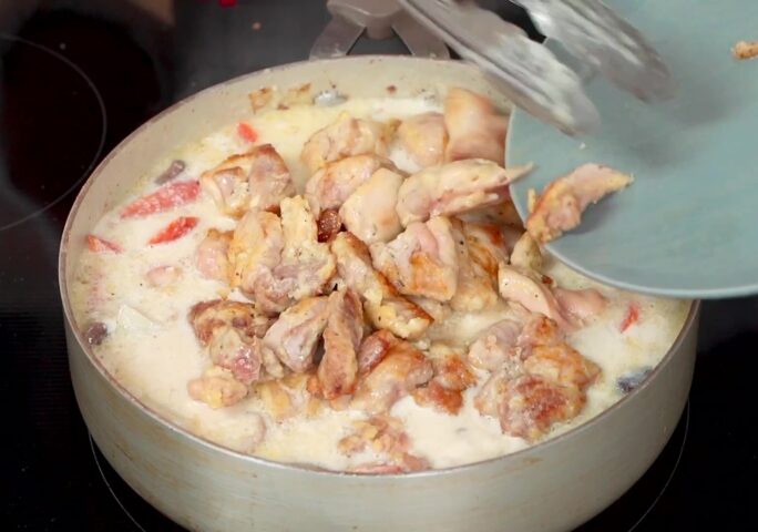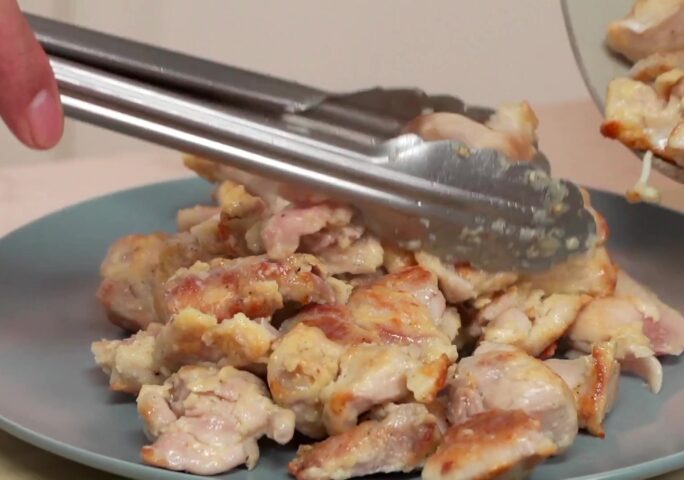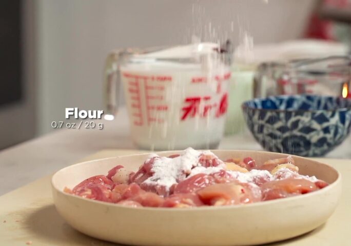 Cut the chicken thigh into bite-size pieces, and season with salt and black pepper. Add an egg and flour, and give it a mix before setting aside for 10 minutes.
