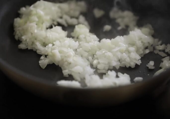 Add some oil to a heated skillet, and add minced onion. Add some salt and pepper to taste, sauté for a while, and set aside to chill.