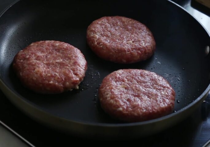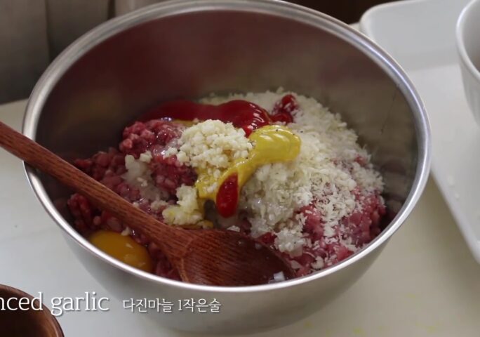 Place saluted onion, meat, and meat seasoning in a bowl and mix well. Divide patty into quarters, make ball shape patties, and flatten top and bottom.