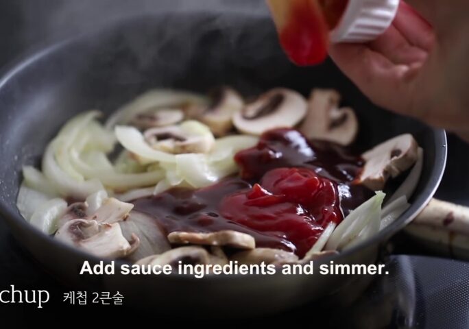 Add butter to a heated pan, place thinly sliced onion and white mushrooms, and sauté for 2 mins. Add sauce ingredients and simmer.