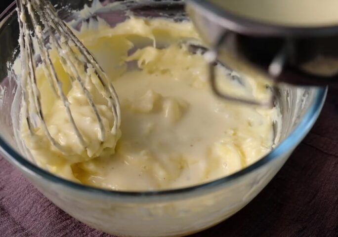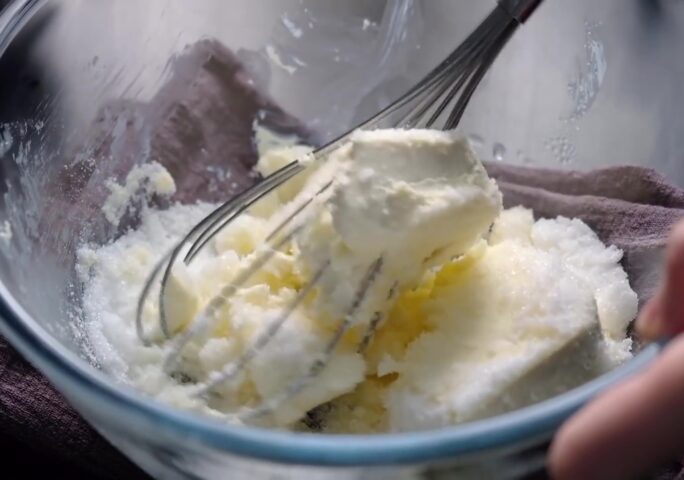 Combine cream cheese and granulated sugar in the bowl, and mix in a hot-water bath until it has a smooth texture.