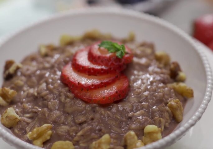Chocolate oatmeal: In a medium saucepan, combine the oats, milk, salt, vanilla, and chocolate powder. Bring to a boil, then reduce to low heat. Cook for 3 to 5 minutes or until the sauce has thickened, stirring a couple of times. Remove from the heat and mix in the honey until everything is well combined. Allow 2 minutes to sit on the side after covering. Serve right away with the chopped walnuts and strawberry slices on top.