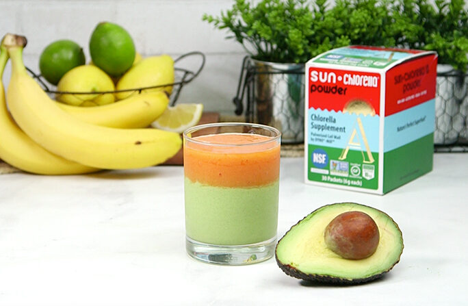 Chlorella Fruit Energy Smoothie: For Avocado layer: Place avocado, Sun Chlorella Powder and orange Juice in a blender and blend on high speed until smooth. Pour into a glass cup, filling 2/3 way. Set aside. For Papaya layer: Blend papaya and banana on high speed until smooth. Pour on to the top of avocado layer. Enjoy!