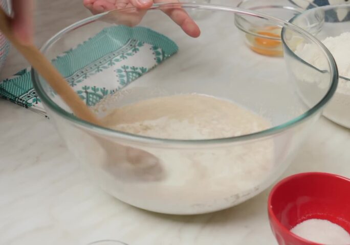 Pour warm milk into a bowl, add sugar and yeast, and mix.