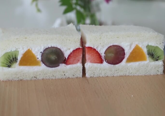 [Fruit Sandwiches] Prepare the fruits and whip the heavy cream with sugar. Paste the cream on the sandwiches and put the fruits inside. Cover with a layer of cream and create a sandwich.