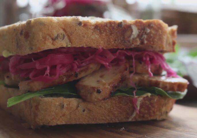 [Red Cabbage Pickle & Chicken Breast Sandwich Ingredients] Pickle some red cabbage, roast some chicken breasts. Paste spread sauce on the bed, add some leaves of arugula, layer the chicken breasts. Add the pickled red cabbage to the top and finish the sandwich.