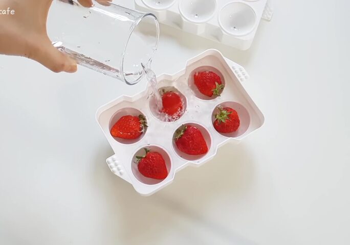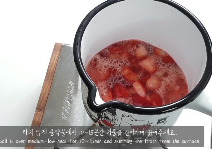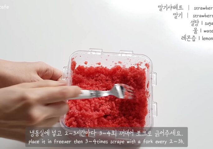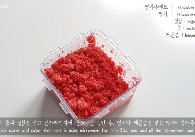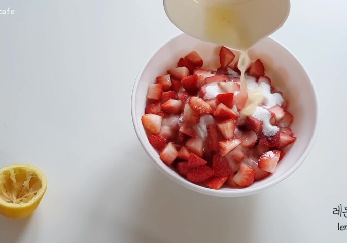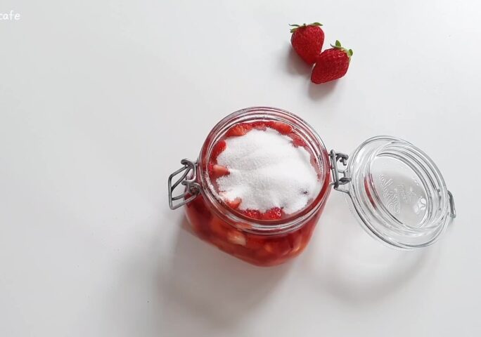 Strawberry syrup: Cut the strawberries to desired sizes. Put a part of them into a bowl and add sugar. Put another layer of strawberries and again add sugar. Repeat until the strawberries are finished.
