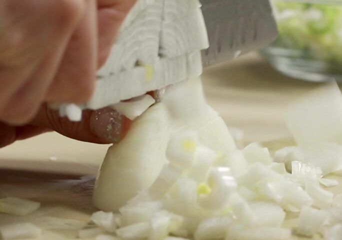 Dice onions and scallions and mince ginger, set aside in separate bowls.