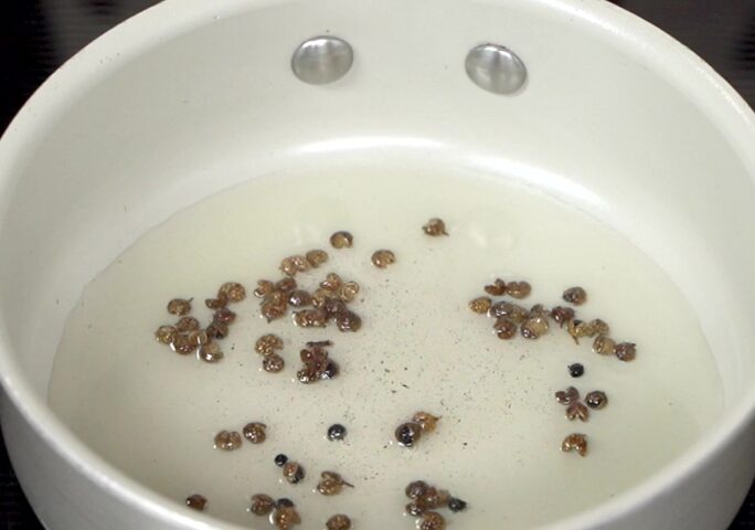 Stir fry sichuan peppers until aromatic, then filter out the oil into a bowl. Add soy sauce into the same pan, bring to boil, and remove to a bowl.