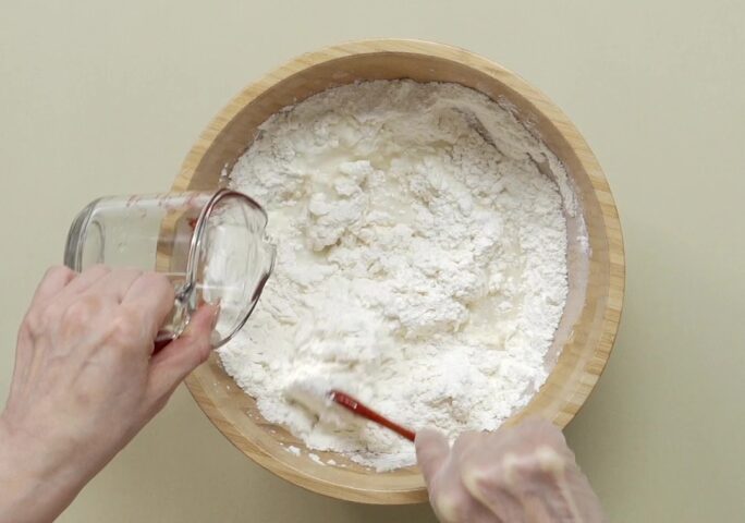 Add salt and water to a bowl of flour, stirring and kneading into a dough. Rest for about 10 minutes. Then knead and divide into smaller pieces. Soak them in a bowl full of oil for 2-3 hours.
