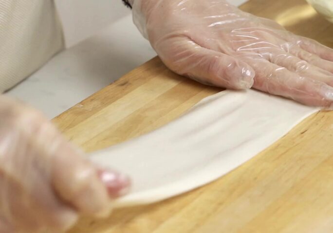 Take a piece of dough, flatten it into a square, and then gently tug it out, so the dough is long and thin. Place a spoonful of meat on one end and fold a corner of the dough over it. Keep folding and rolling from one end of the dough to the other, tucking the meat inside.