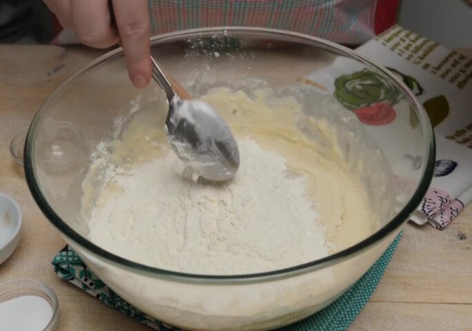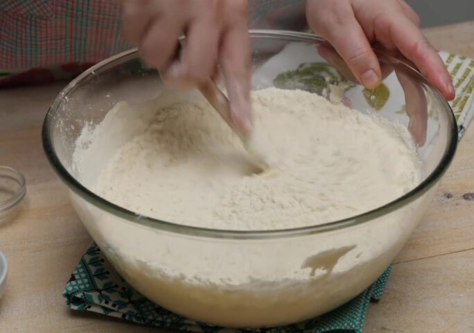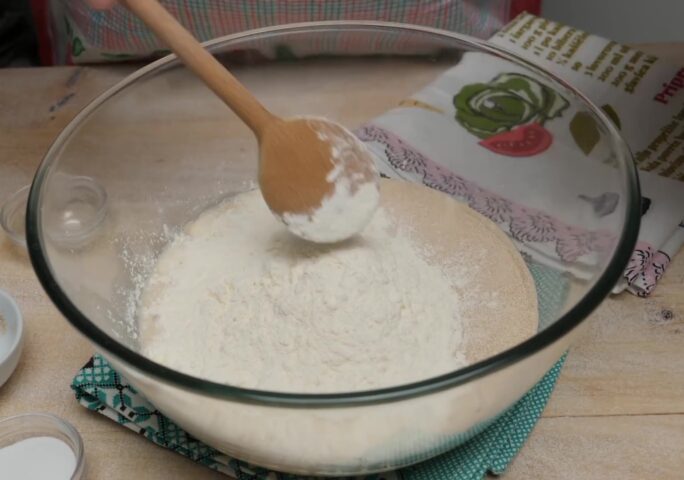 In a large bowl, pour warm milk and water. Add sugar, yeast, and a little flour and stir to mix well.