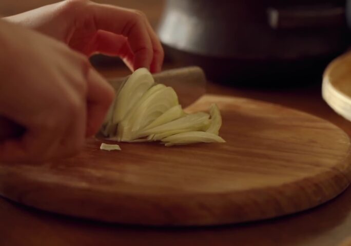 Cut the cabbage into bite-size pieces. Julienne the onion into thick pieces. Chop the small green onion.