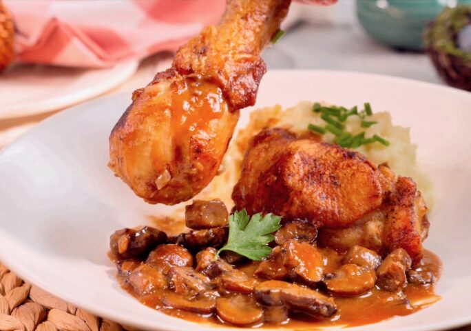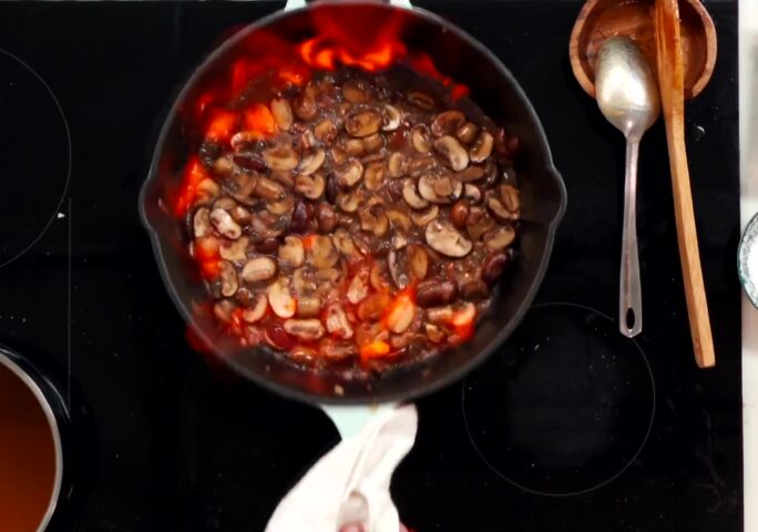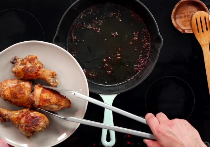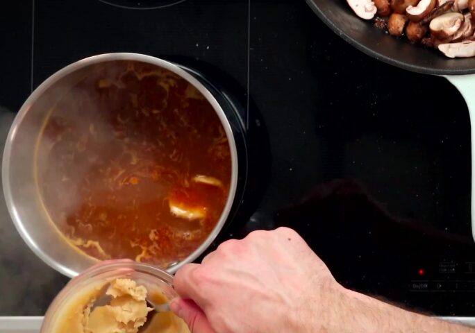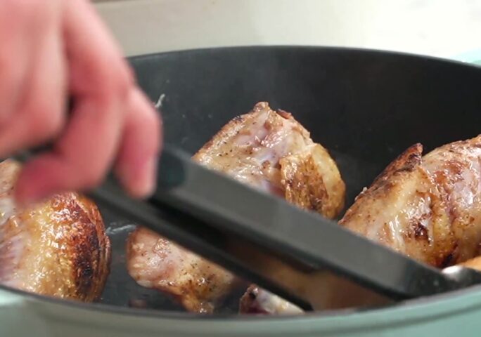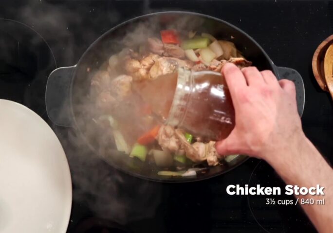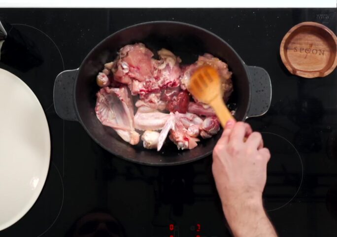 In a large pot, heat up vegetable oil over medium-high heat and brown the chicken bones and giblet. Meanwhile, roughly chop onion, carrot, and celery. After the chicken turns golden brown, add vegetables into the pot.