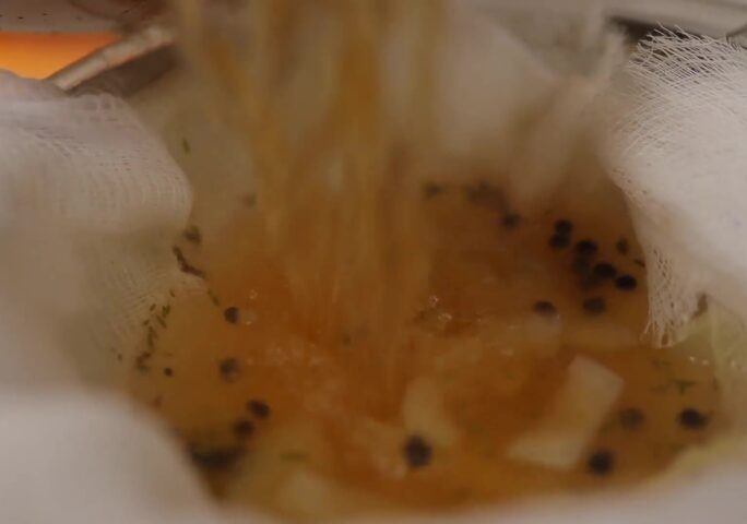 When stock is a rich golden color, remove from heat and strain through a fine-meshed strainer (lined with cheesecloth for a cleaner-looking broth.)