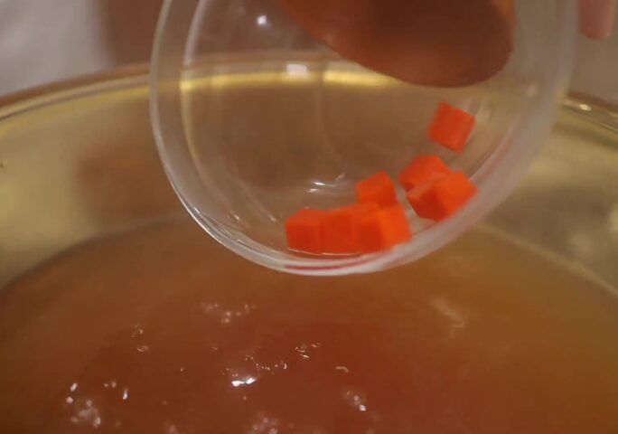 Add veggies to strained stock and simmer until they are tender, about 10 minutes. Remove the meat from the bones and add to soup.