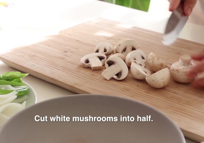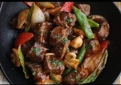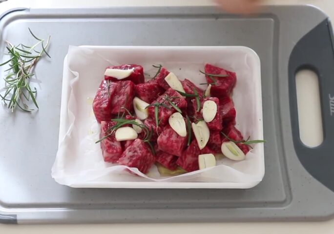 Place steak on a kitchen towel and remove the blood. Chop steak into 3cm cube, marinade with olive oil, garlic slice, salt, and pepper, and rest for 5 mins.