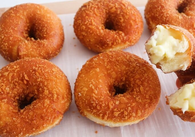 This recipe is very easy and very delicious! So crispy and creamy homemade donuts filled with yogurt cream. Sweet and delectable dessert.