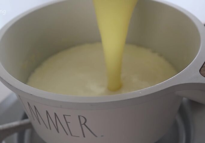 Pour heavy cream into a small pot. Add yogurt. Cook on medium-low heat.