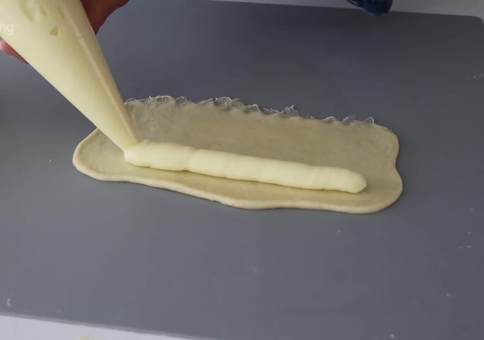 Put the yogurt mix into a piping bag. Roll out one dough ball to a rectangular shape, take the piping bag and push some yogurt filling on the dough. Cover with the dough so, that it will form a roller.