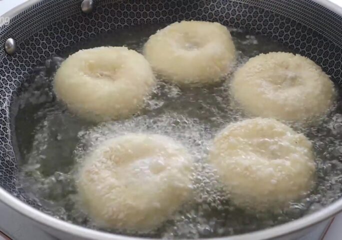 Pour some oil into a frying pan on medium heat. Fry the donuts until golden brown.