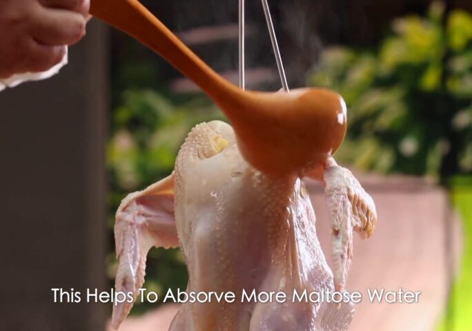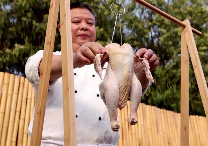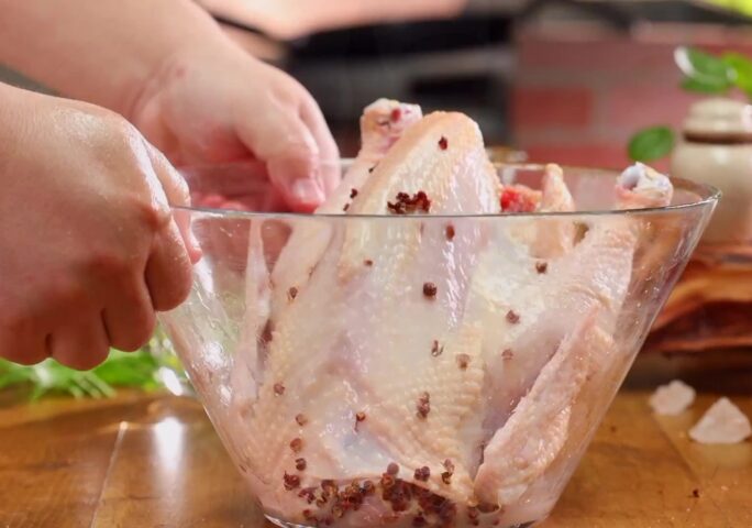 First, wash the whole chicken and put it into a large container. Apply salt to the entire chicken body, put some Chinese prickly ash in the belly of the chicken, stuff it with slices of green onion and ginger, and finally pour white wine. Place in refrigerator to marinate for 6 hours.
