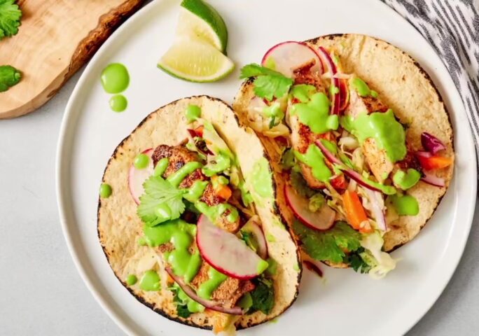 Easy fish tacos are quick to make and packed with flavor. Layer simply seasoned fish over crunchy slaw and topped with the best fish taco sauce ever! These delicious tacos promise to create a party in your mouth. The taco sauce is made of cilantro, pickled jalapenos, garlic, greek yogurt, lime juice, and salt. It’s creamy, spicy, bright, and pairs perfectly with the crunchy slaw and smokey fish.