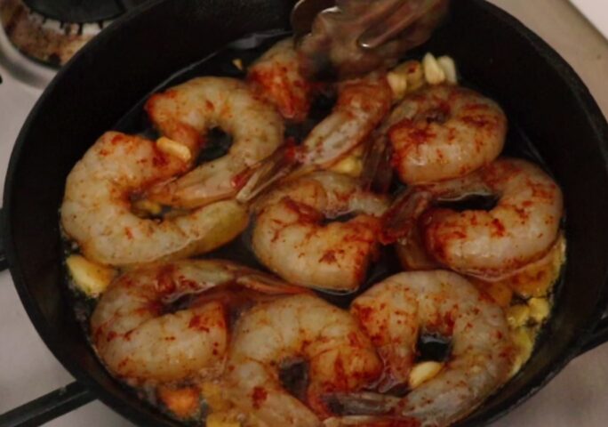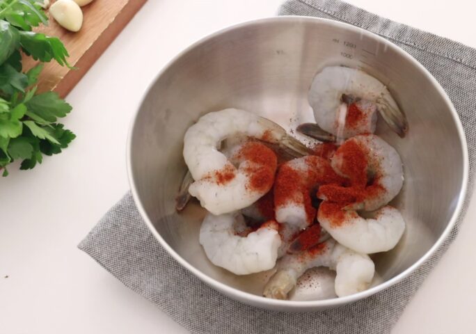 Marinate the prawns with a pinch of sea salt flake, 1-2 teaspoon smoked paprika, and some black pepper for around 5-10 minutes.