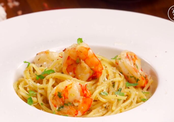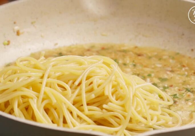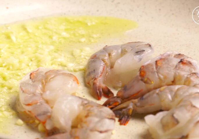 Add white wine stir a little bit, then add the pasta water, chile flakes, Italian seasoning, chopped parsley, salt, and pepper, mix well then put the cooked spaghetti and shrimp back to the pan, raise the heat to high, stir fry for about 30 to 60 second, you can add more pasta water if too dry, then remove the pan from the heat.