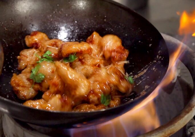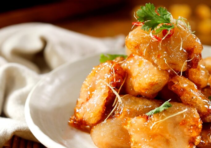 Crisp golden slices of pork tenderloin are coated in a luscious sweet and tangy glaze, delivering the perfect balance of texture and flavor. Each piece is carefully marinated with Shaoxing wine and white pepper, ensuring a tender and aromatic bite. The pork is then coated in a delicate potato starch batter, double-fried to achieve a light and crunchy exterior.