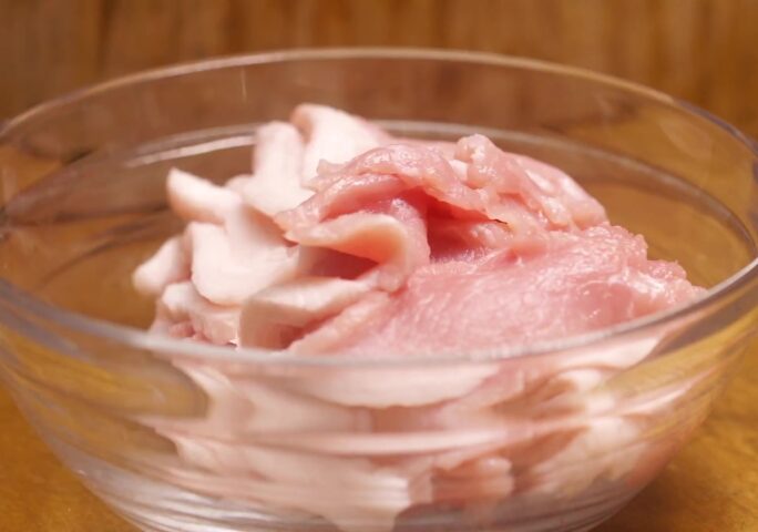 First, cut the skinless pork leg into pieces about 4 cm long, 3 cm wide, and 0.3 cm thick, and put them in a bowl for later use.