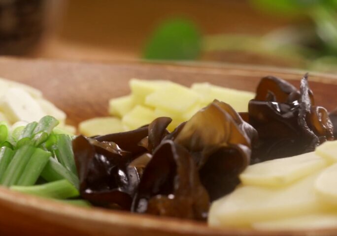 Cut the winter bamboo shoots into pieces, cut the fungus into small pieces, cut the ginger and garlic into pieces, cut the shallots into the shape of horse ears, and chop the peppers for later use