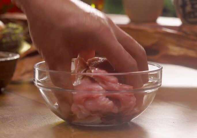 Put the cut meat slices into Shaoxing cooking wine, salt, and soy sauce to pinch evenly and set aside.
