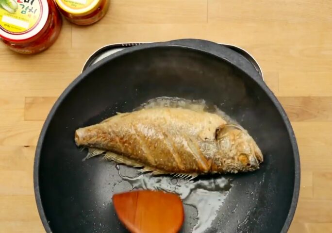 Remove some of the oil in the pan and roast ground ginger and ground garlic over a low heat. Then add soy sauce and roast over a medium heat. Bring the fish to boil in 10 minutes over low heat. Flip over the fish to heat again before moving to another dish.