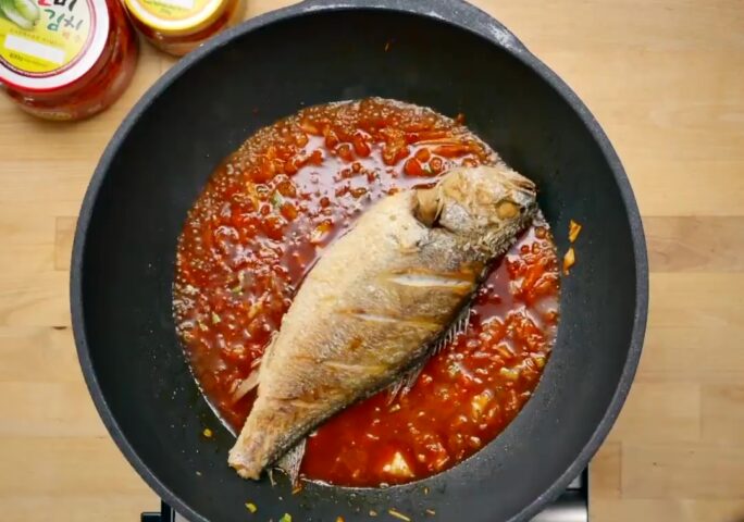 Braised Kimchi Tofu Fish: For better seasoning, make two cuts on each side of the fish and apply salt. Wait for 10 minutes. Apply flour thinly on the fish and fry on the pan until the color turns a golden brown.