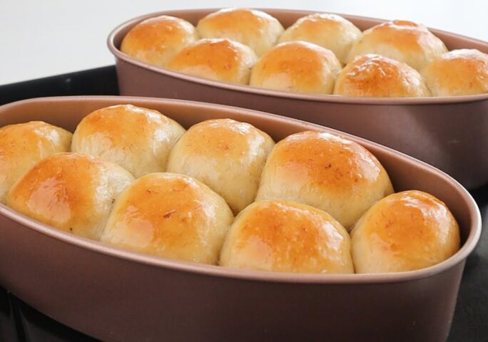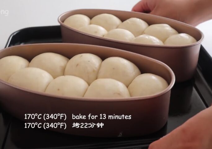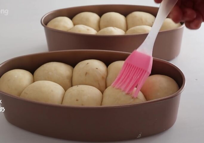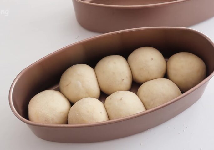 Take 2 molds and coat them with unsalted butter. Put the balls into the molds, cover, and let them rise for 50 minutes.
