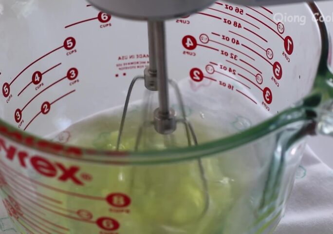 Add 2 grams of lemon juice into 5 egg whites. Whip first on medium-high speed. Add sugar and when large fish-eye bubbles appear, add 1/3 of the sugar. Continue whipping at medium-high speed.