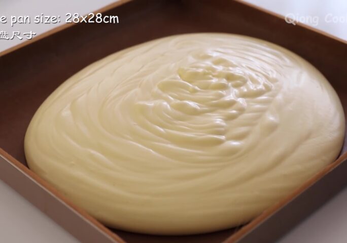 Pour the batter into the baking pan. Smooth out the surface and shake twice to remove the large air bubbles.