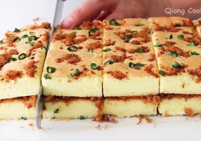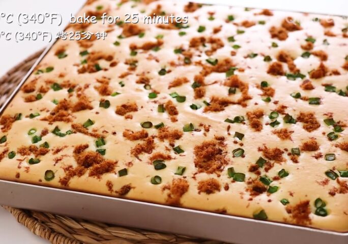 Put on the meat floss. Then put on some chopped green onion, omit it if you don't have it. Bake in the middle of a preheated oven at 340 °F/170 °C for 25 minutes.