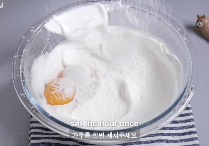 Add 2 yolks and sift in the cake flour.
