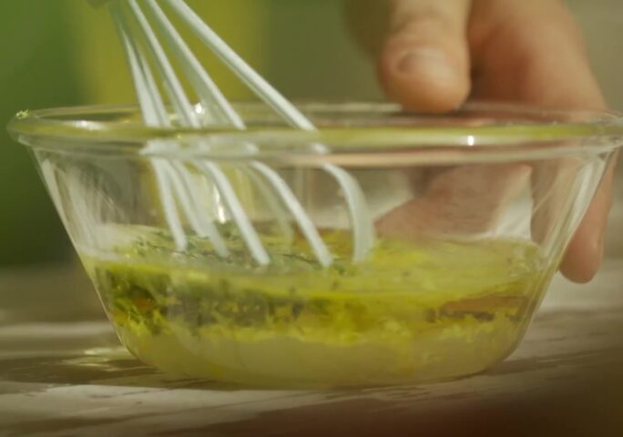 Line a rimmed baking sheet pan with parchment paper on it. In a separate mixing bowl combine the olive oil, bone/chicken broth, lemon zest, lemon juice, and parsley.