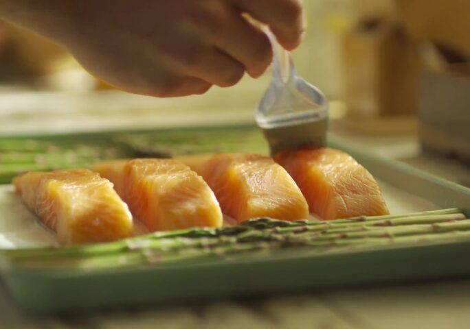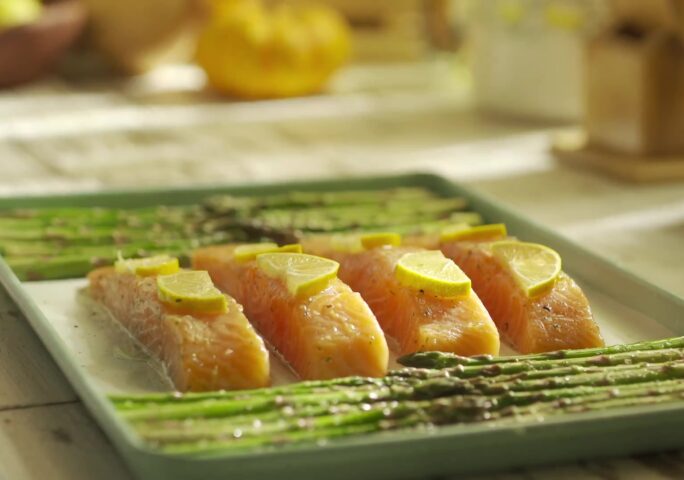 Season the salmon and the asparagus with salt and black pepper to taste.