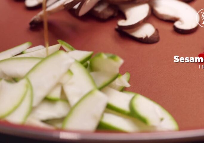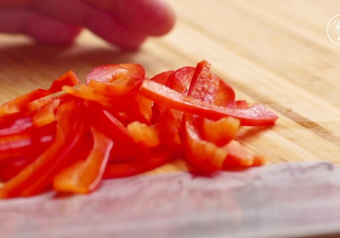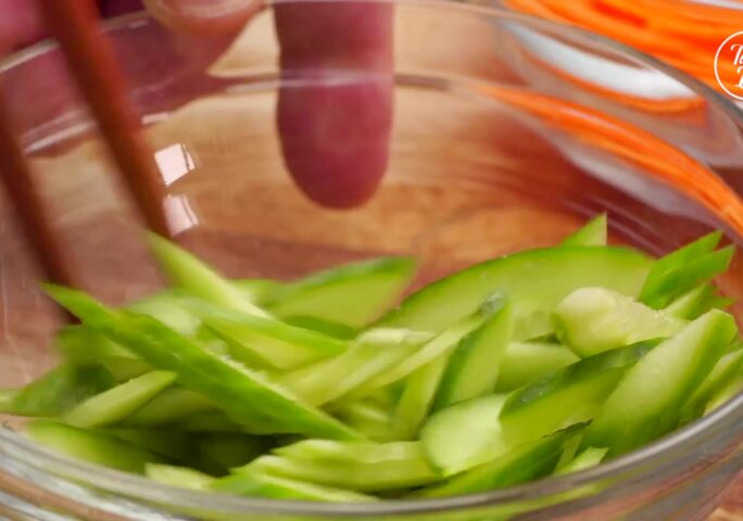 Julienne the red bell pepper. Cut the hairy gourd into slices. Cut the fresh shiitake into slices. Julienne the carrot. Slice the cucumber.