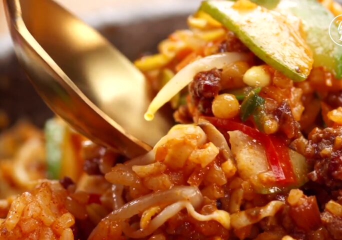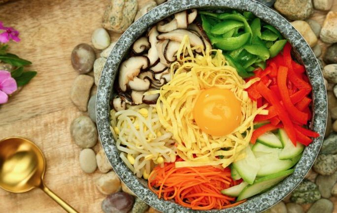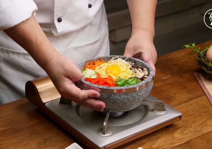This Korean Bibimbap is a delicious cavalcade of flavors. Ground beef in a spicy sauce and the with all sorts of seasoned sautéed vegetables altogether with cooked rice and steamed in a stone pot for a final cook. The final result is spicy, mixed rice with meat and vegetables and egg yolk. Worth trying!